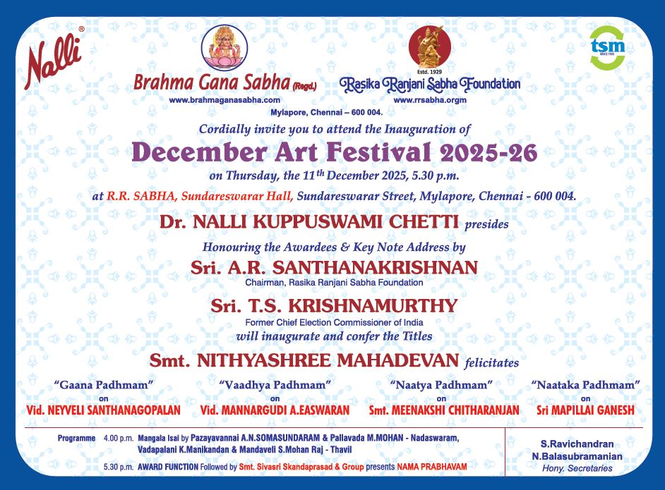 The festival runs from December 11, 2025, to January 26, 2026, at the Rasika Ranjani Sabha.